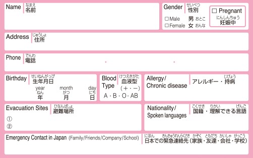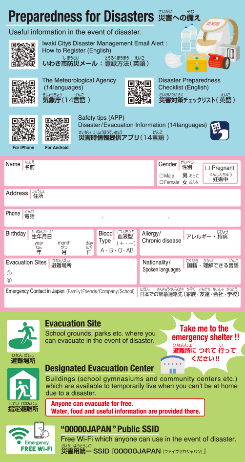★This card contains information on emergency hotlines, as well as disaster tips, and other useful information for what to do in the event of disaster. To prepare for emergencies, please register with Iwaki City’s Disaster Management Email Alerts, in addition to writing the name of your nearest shelter and personal information in this card, and carrying it with you at all times.